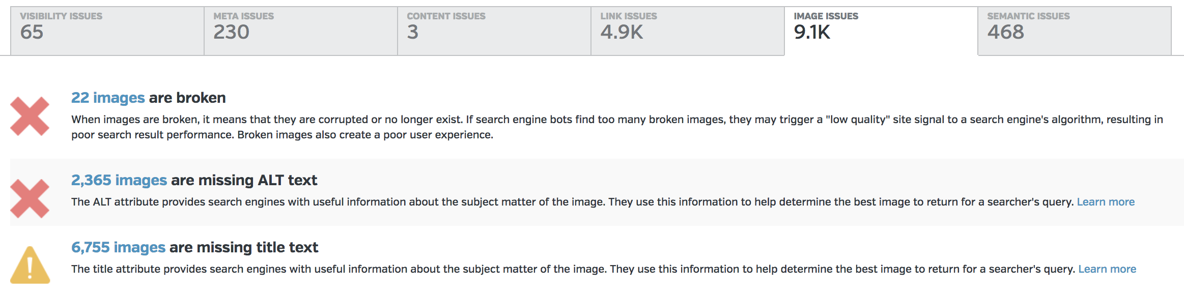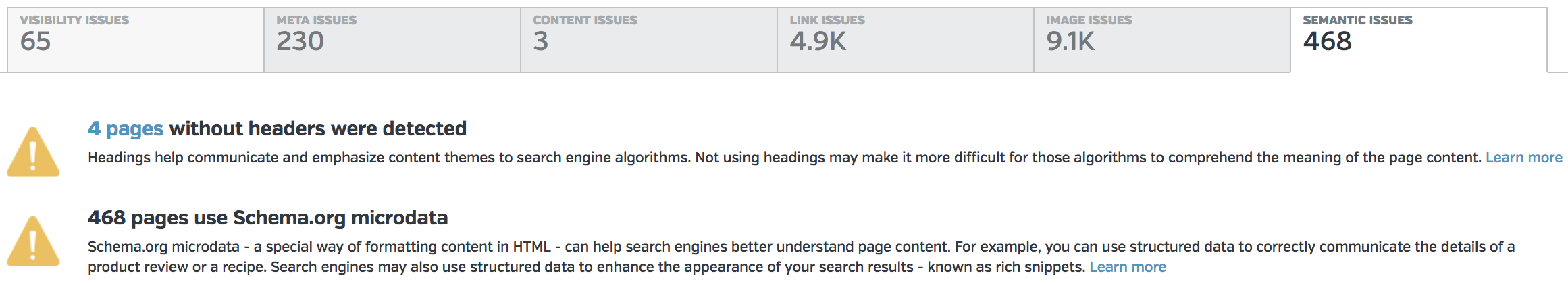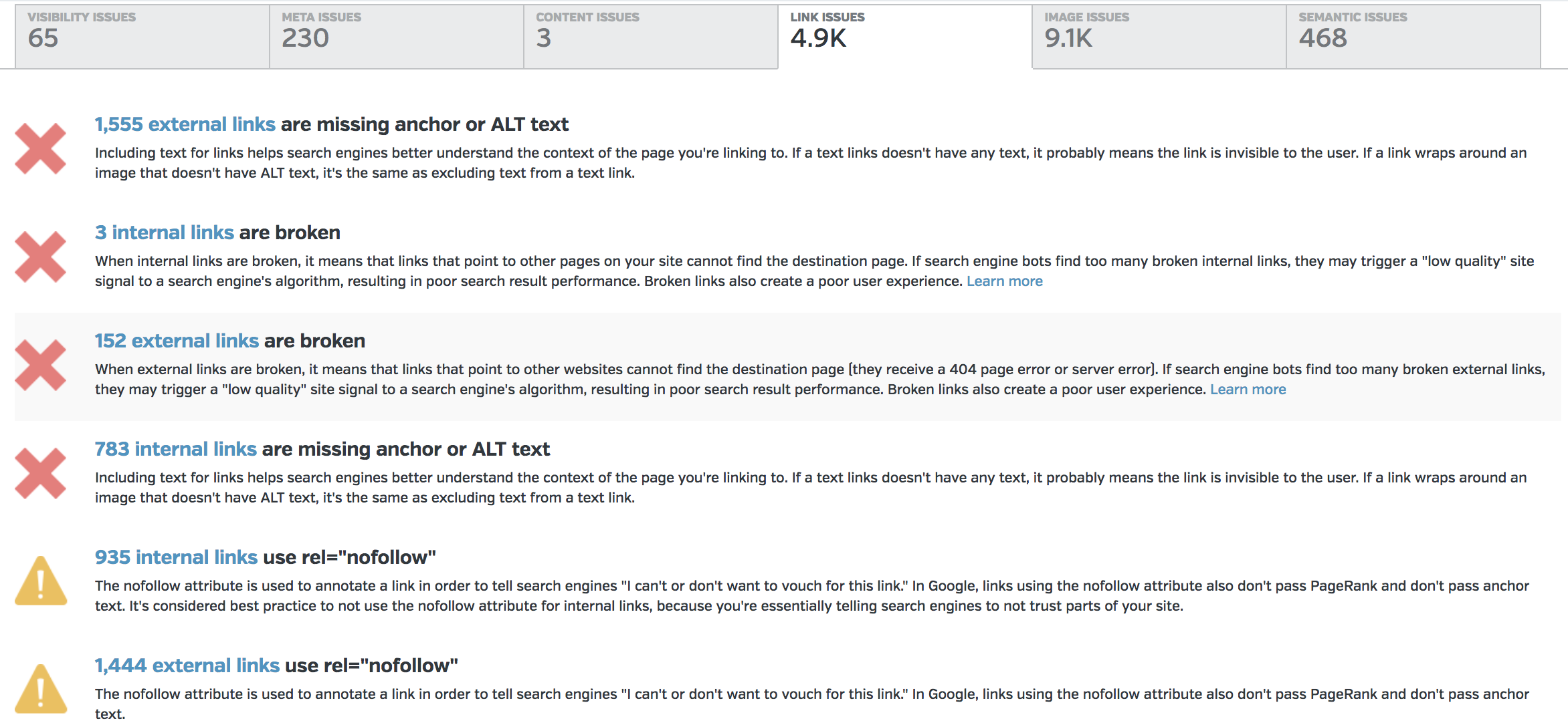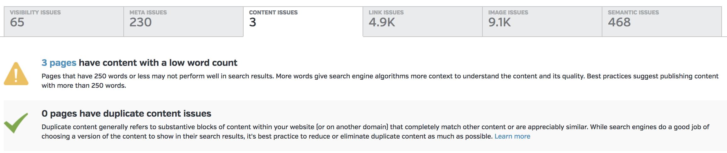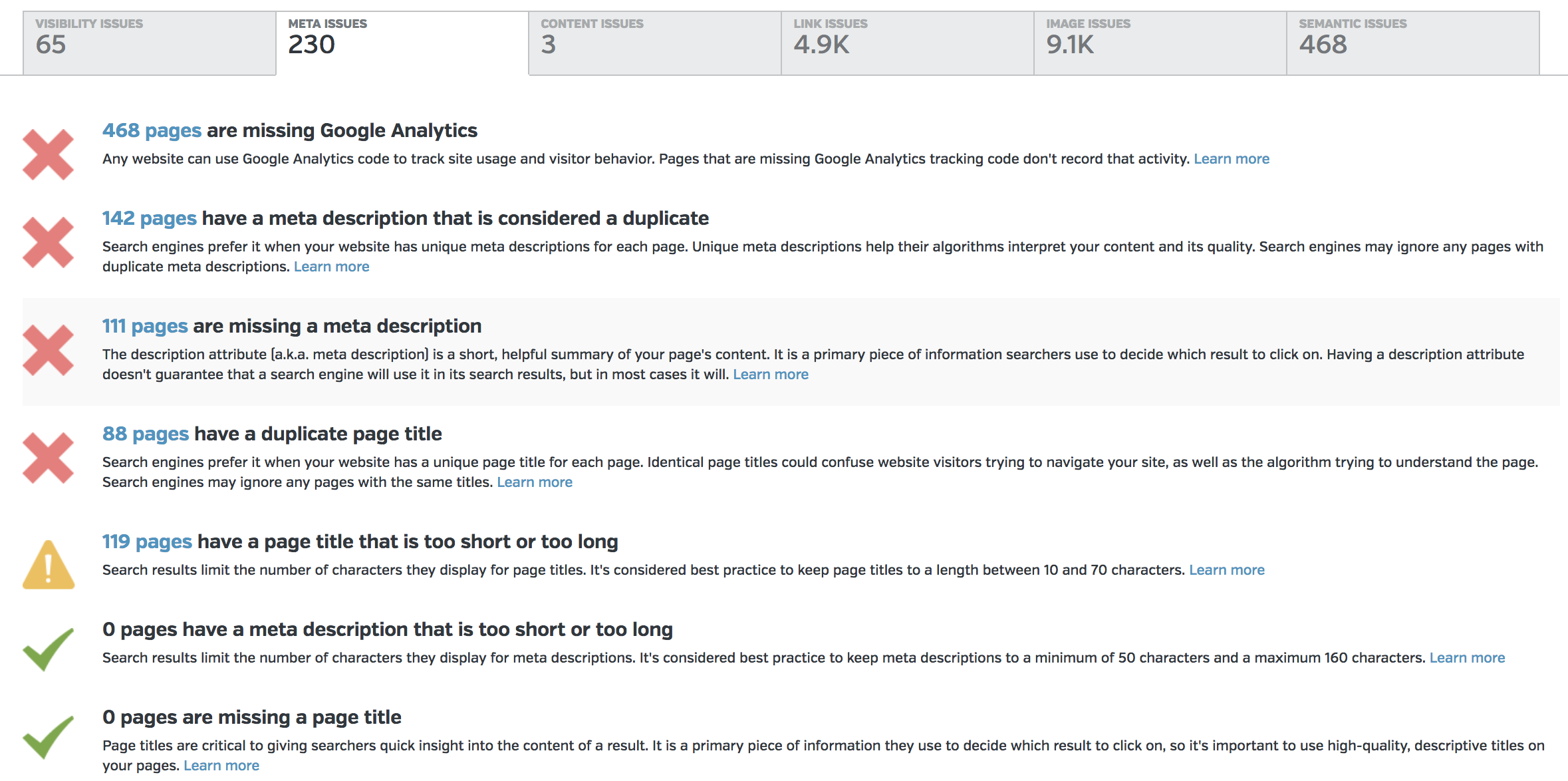 The Raven Tools Website Auditor categorizes all issues into 6 primary buckets in the default view.